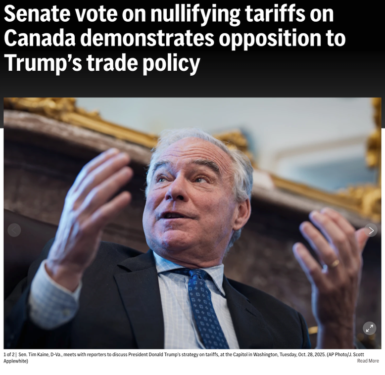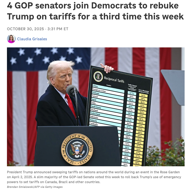首先是10月28日,参院以52:48通过决议,终止支撑对巴西大幅加征关税的“国家紧急状态”;接着是10月29日,参院以50:46的接近票数否决对加拿大加征关税;随后,10月30日,参院再次以51:47通过否决,意在终止总统以“国家紧急状态”为由推行的全球普遍性关税授权,直指这套做法的法律底座。