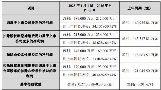 【大河财立方消息】10月13日,广东领益智造股份有限公司(简称领益智造)披露2025年前三季度业绩预告。预计归属于上市公司股东的净利润为18.90亿元–21.20亿元,比上年同期增长34.10%-50.42%。基本每股收益为0.27元/股–0.30元/股。